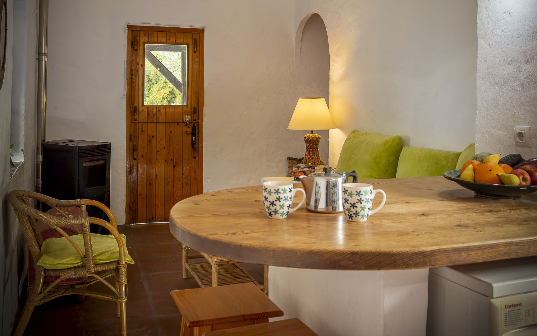 This house has a natural garden complete with a hammock and a covered terrace with a large dining table and chairs. The small and cosy living room has a pellet stove at one end and the kitchen at the other, separated by soaring Arabesque arch. Kitchen door gives access to the courtyard of the house (shared by the Casita del Medio). The courtyard is only to be used when both properties are being rented together (see below). Off the kitchen is a small bathroom with a glass brick shower.
