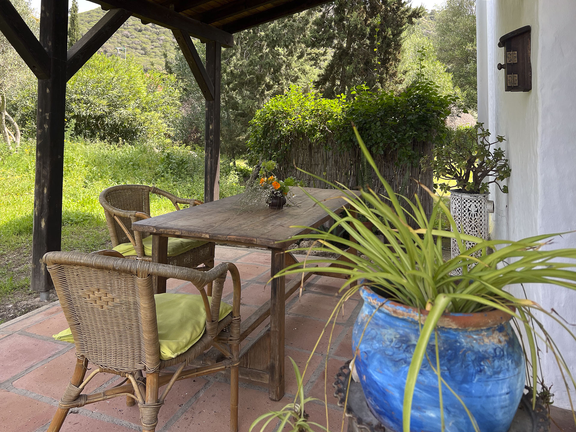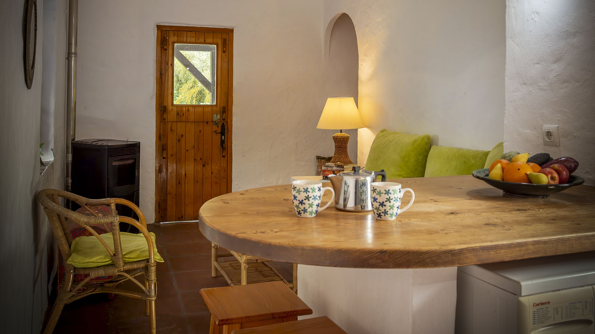 This house has a natural garden complete with a hammock and a covered terrace with a large dining table and chairs. The small and cosy living room has a pellet stove at one end and the kitchen at the other, separated by soaring Arabesque arch. Kitchen door gives access to the courtyard of the house (shared by the Casita del Medio). The courtyard is only to be used when both properties are being rented together (see below). Off the kitchen is a small bathroom with a glass brick shower.