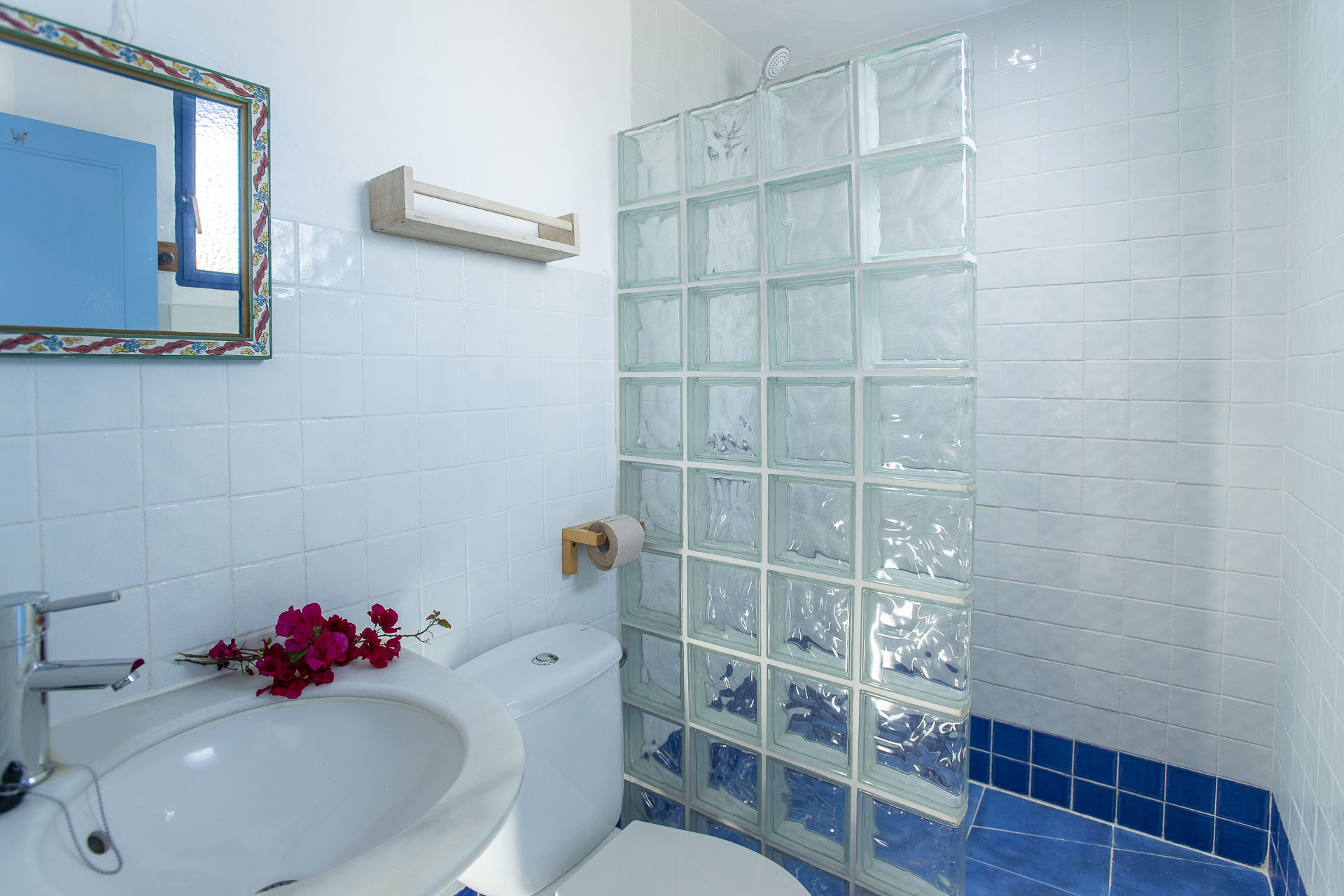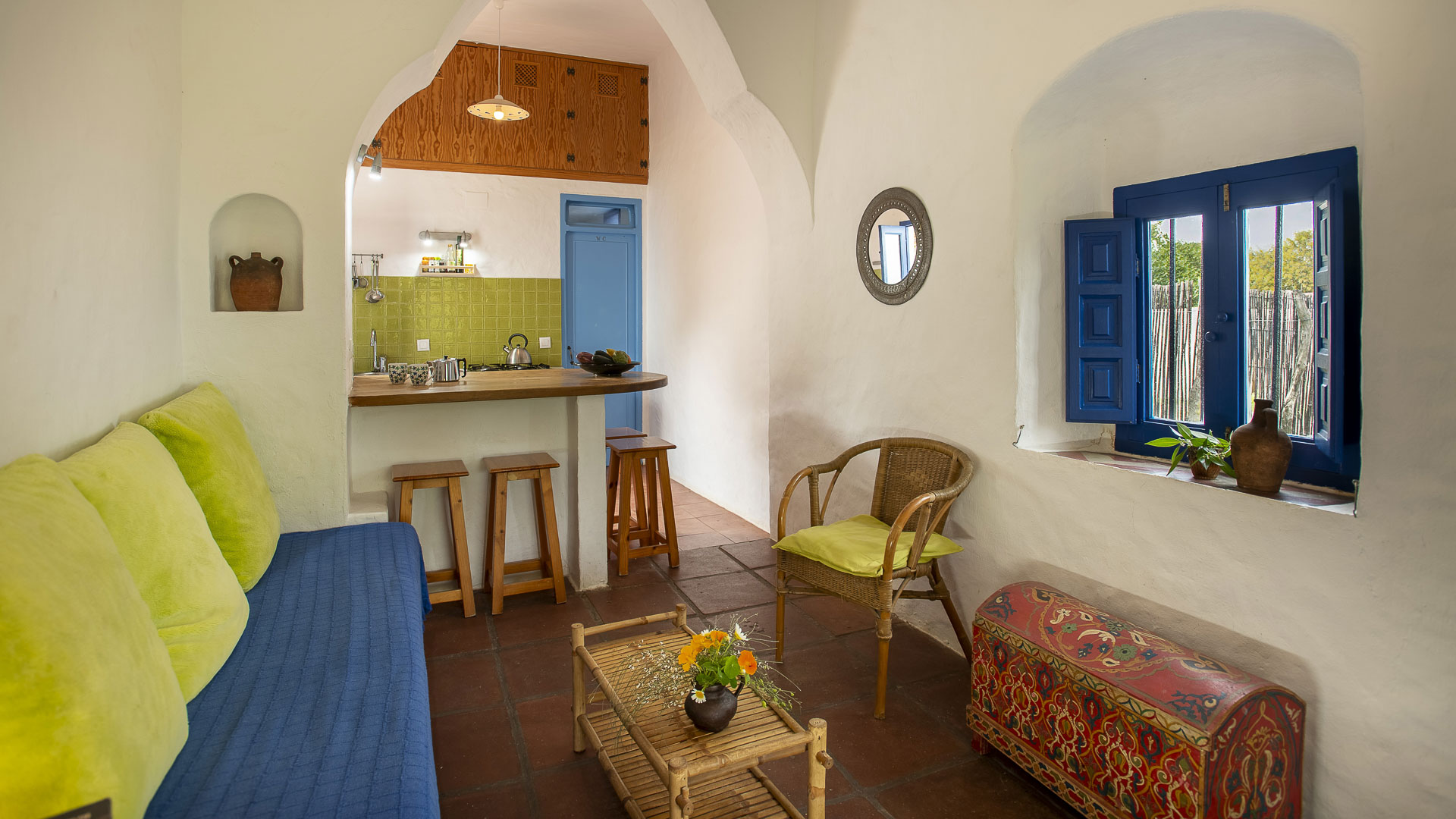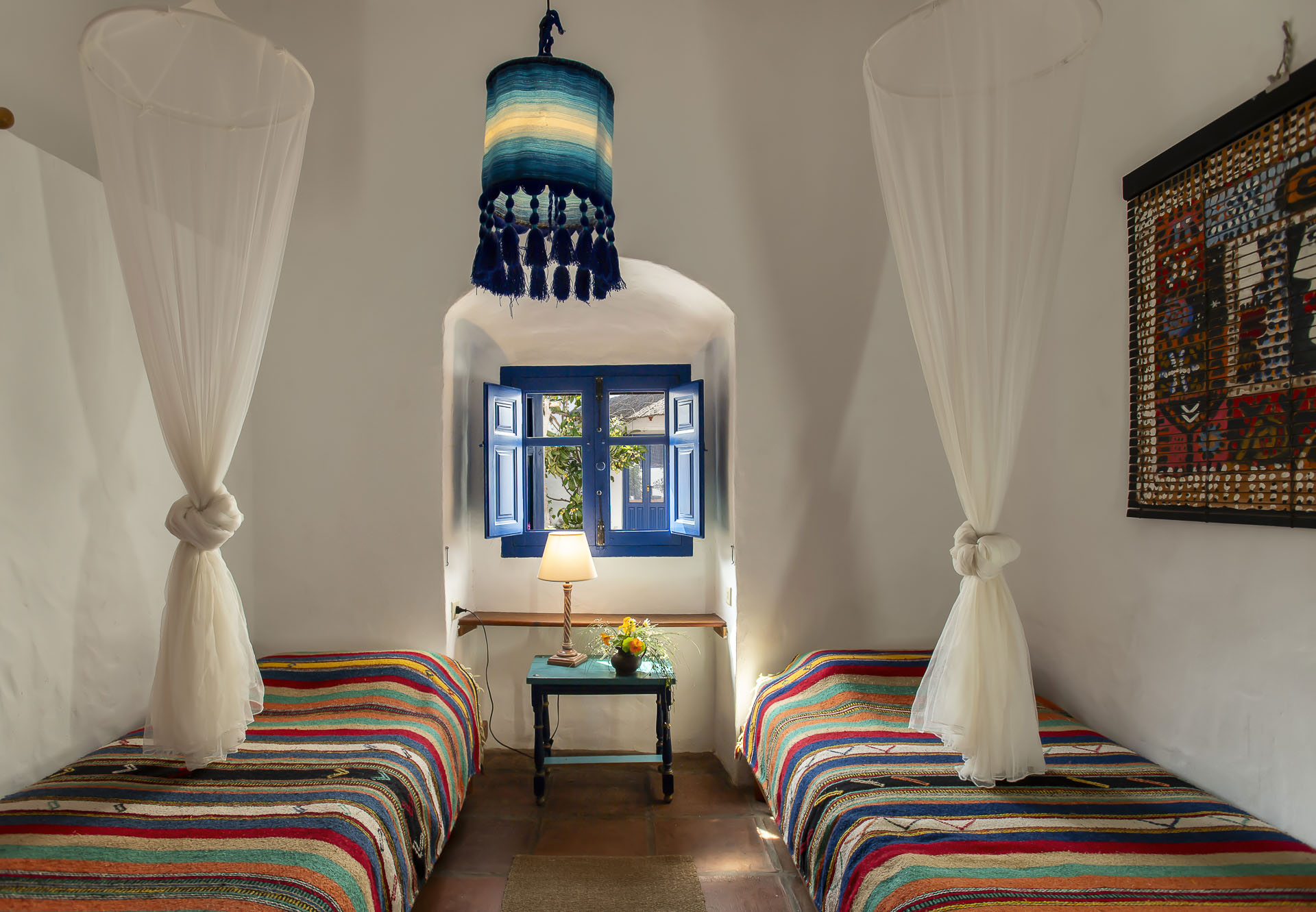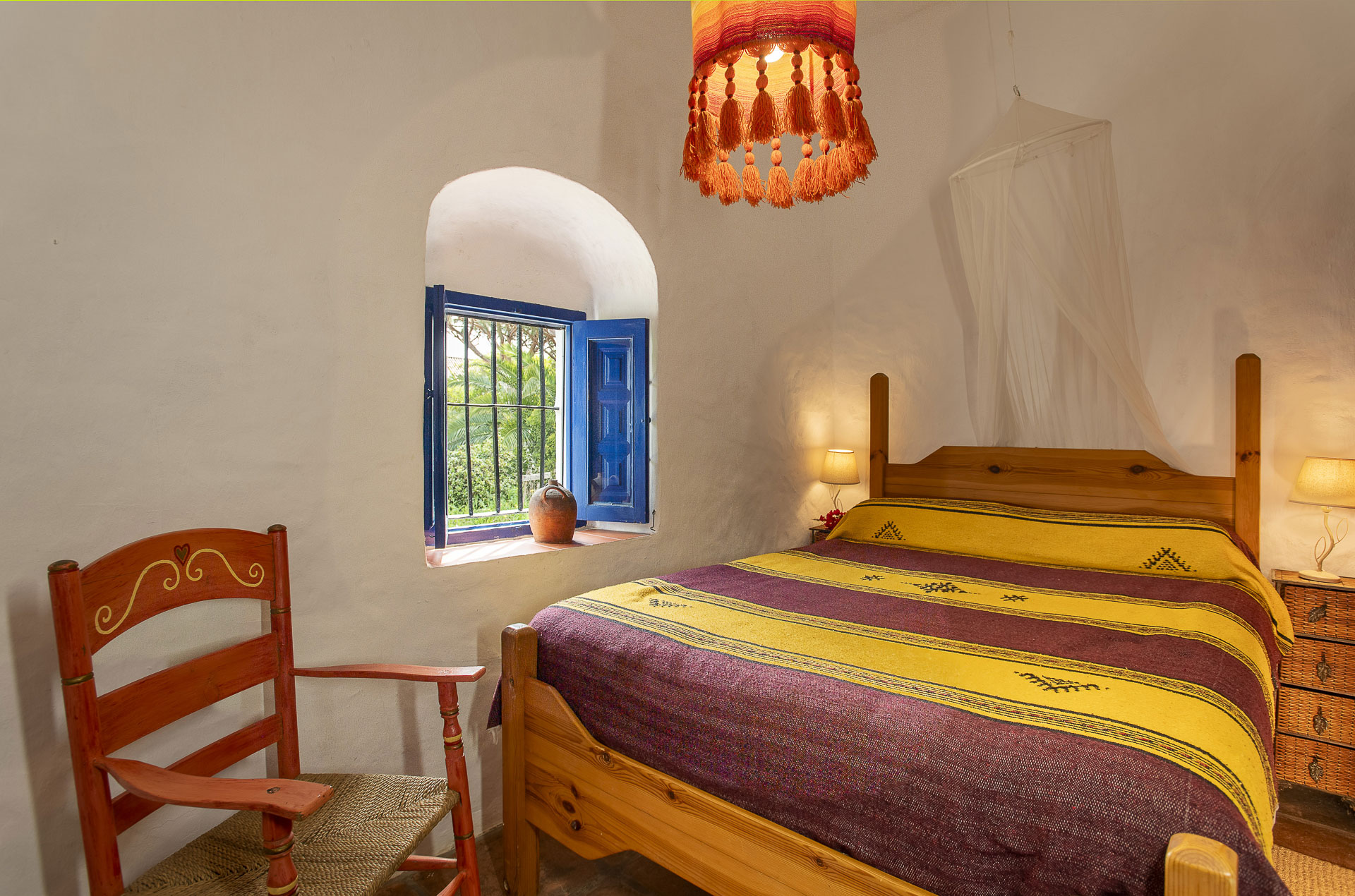 The bedrooms in this old Andalucian farmhouse are located in a wing off the main living room: the first a twin room with plenty of storage space that looks onto the courtyard, and the second a compact double room with a window looking onto the garden. Because it’s all arranged on the ground floor with direct access to the garden and terrace it is a good choice for families with young children.