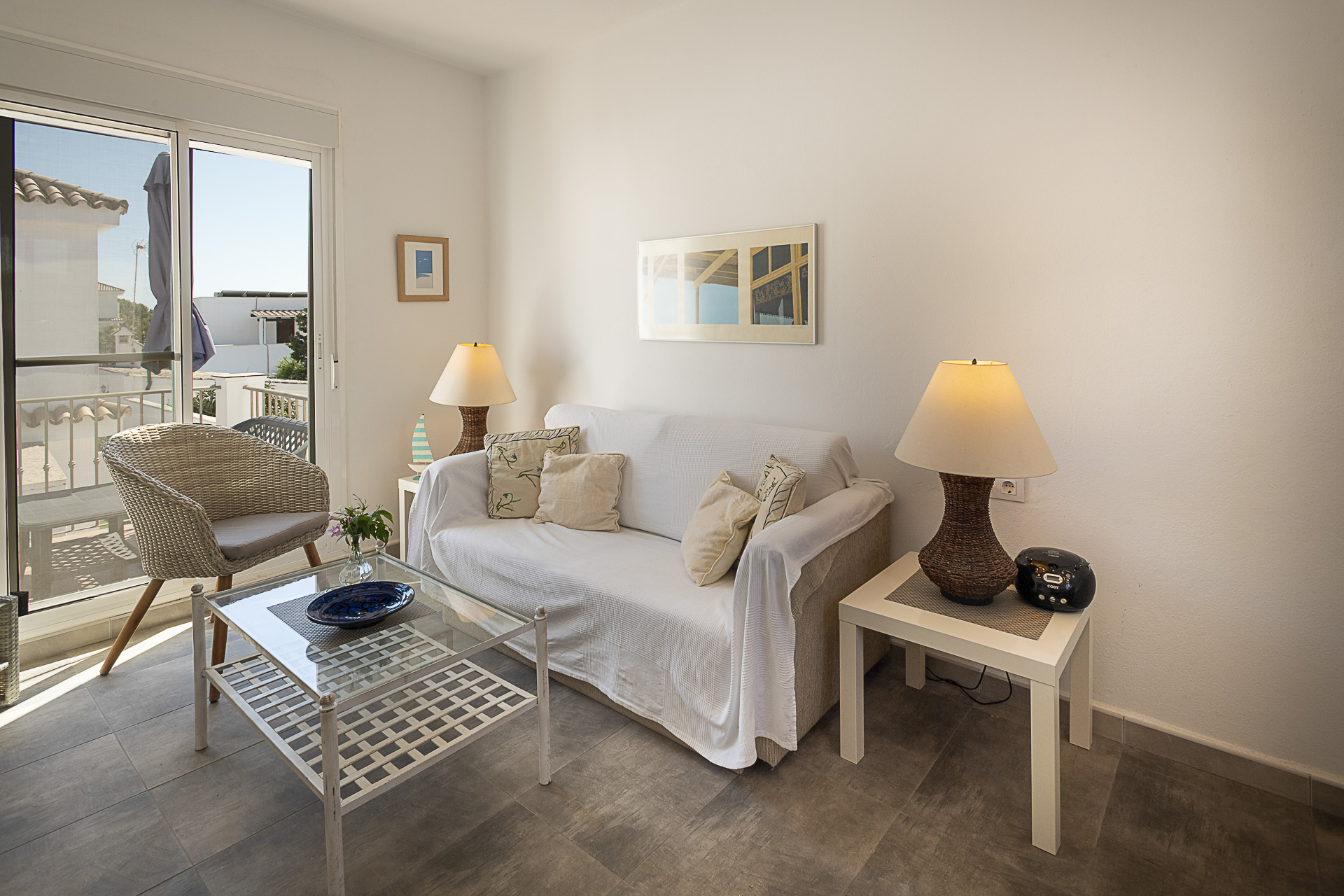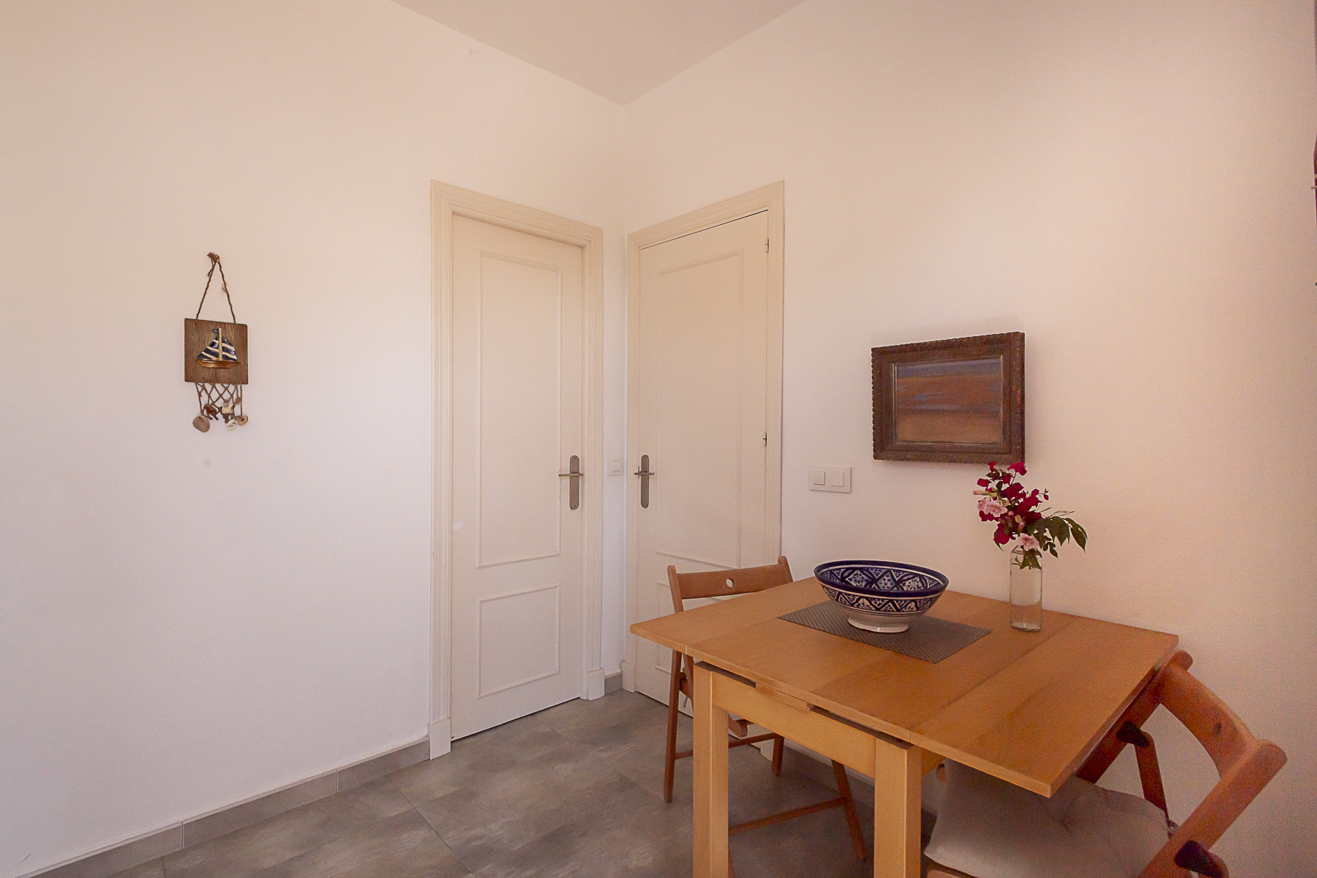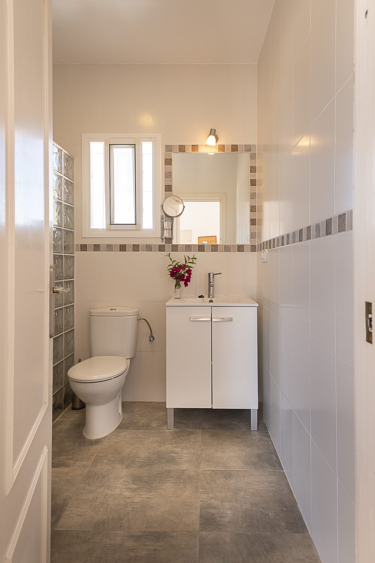 There is a double bedroom with a built in wardrobe. Next to the bedroom is a large bathroom with a modern rectangular shower and washing machine. From the bathroom window one can also see the beautiful Natural Park.