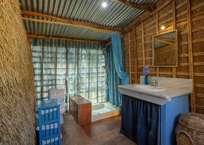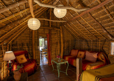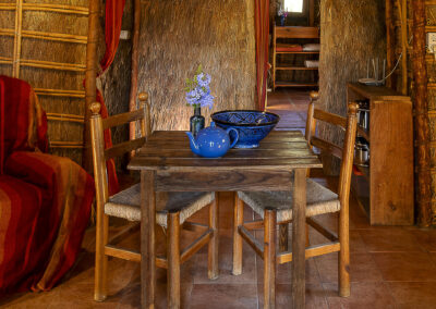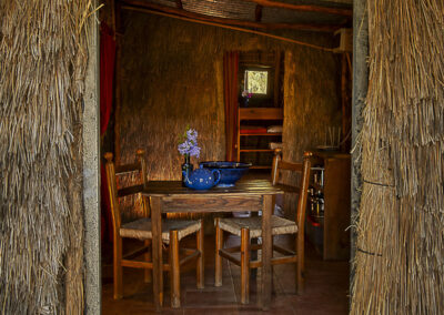 Small dwellings built of straw, wood poles, bamboo and string known as chozas, are typical to the area of La Janda, Cádiz. The Choza Pequeña consists of three rooms with a rainproof terrace for al fresco dining. The country-cottage style kitchen has an armchair and small dining area. This leads to a large double bedroom with a handcrafted wooden bed (as well as a single sofa-bed) and ensuite bathroom. It has plenty of wardrobe space and two small wooden windows, one with a beautiful view onto the pine-hooded dunes.