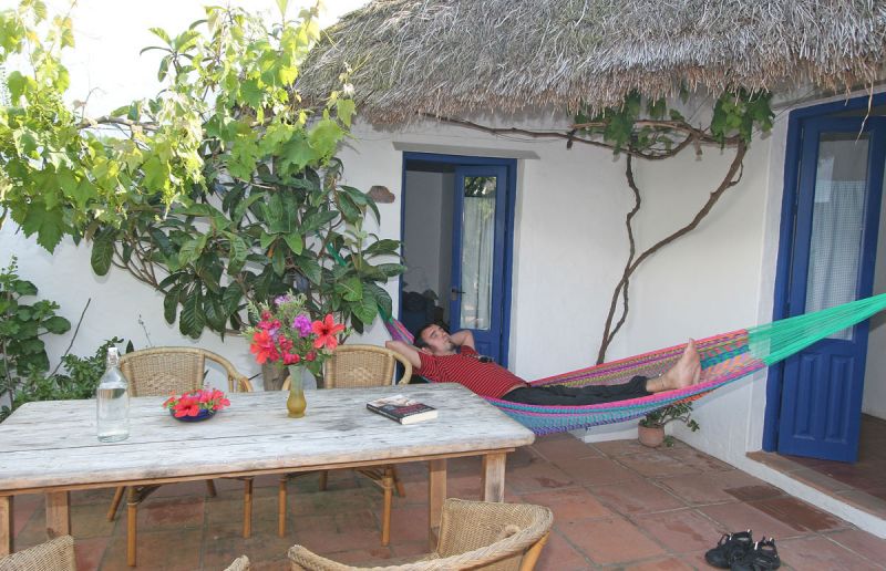 Chozas sind aus Stroh, Pfählen, Bambus und Schnüren gebaut. Sie sind typisch für diese Gegend von La Janda, wo die Menschen früher in chozas de paja lebten. Hier wurde eine dieser Chozas renoviert, um sie in den heutigen Wohnbereich umzuwandeln.