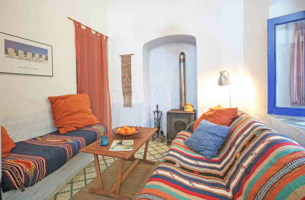 Das Wohnzimmer ist sehr hell und hat eine Terrassenschiebetür, die auf einen kleinen, ummauerten Garten mit Solarleuchten für den Abend führt. Es gibt einen Holzofen mit einer Glastür für gemütliche Abende im Winter.