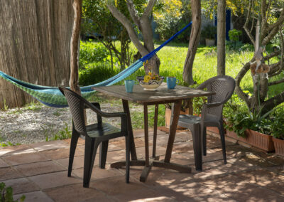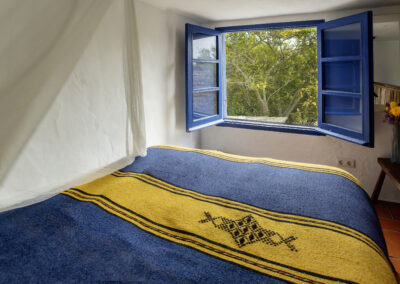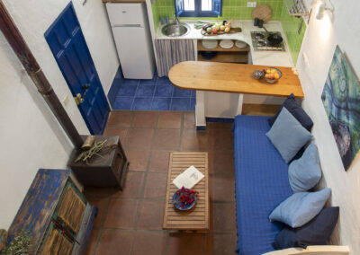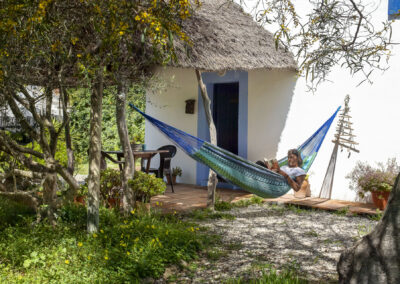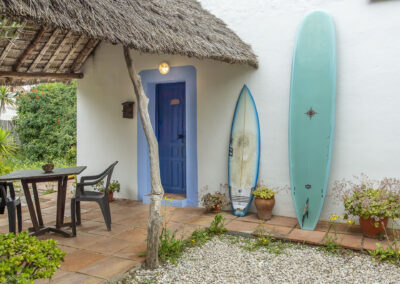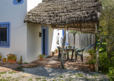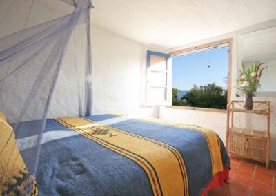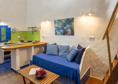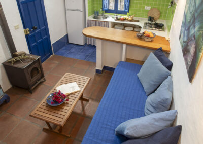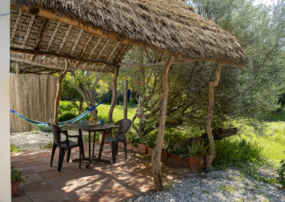 Steep wooden stairs lead up to a pretty double bedroom on the mezzanine with a large window with wonderful views over the countryside. Beneath the mezzanine is a light, airy bathroom. A thatched-roof terrace is enclosed by sweet smelling rosemary and lavender bushes making it a lovely romantic getaway at any time of year.