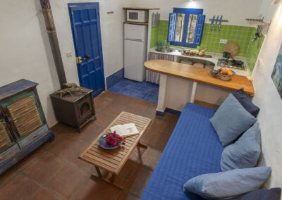 This compact studio space combines rustic simplicity with modern flare. The kitchen has a wooden breakfast bar and plenty of space for cooking. It adjoins the living room, which has a wood-burning stove, making it particularly warm in the winter, and a built-in sofa for snuggling up on.