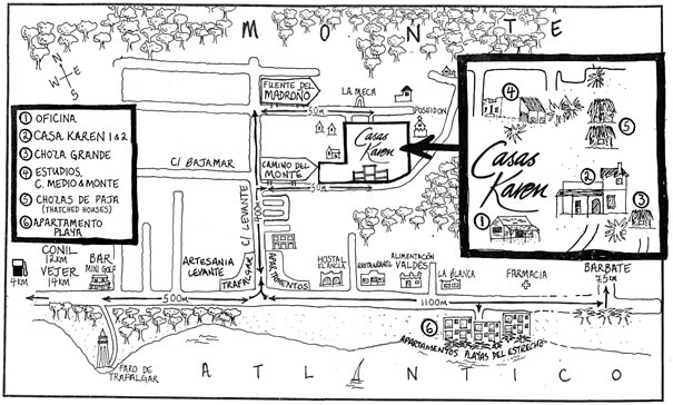 Approximately 4km further on you will see the road leading to Cape Trafalgar and the lighthouse on your right, and to the left, the Hostal Cafetería Mini-golf. This is the start of Los Caños de Meca. Continue for approximately 500 metres and at the fourth street on your left you will see the Artesanía Levante, Café & Restaurante. Turn left here into the tarmacked Calle Levante with two tiled signs at the entrance. One reads ‘Apartamentos and Bungalows’, the other ‘Trafalgar’.